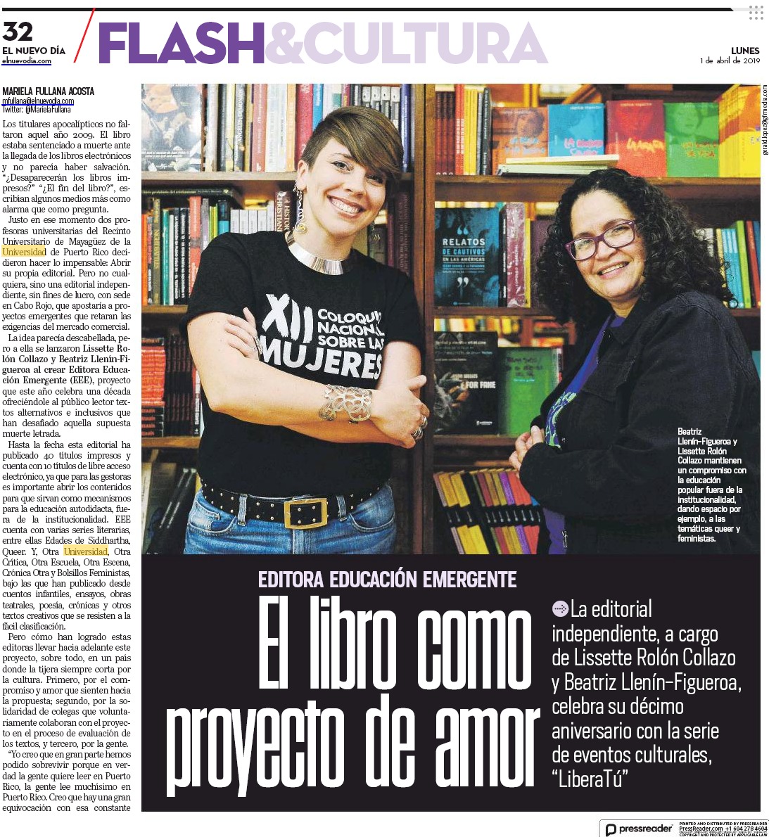 At Editora Educación Emergente (EEE) we believe in an open, inclusive, and diverse culture, nurtured by the creative and critical reciprocity that characterizes reading and writing. We are committed with inclusion in all phases of our books’ evaluation, production, and distribution process. Our meticulous editorial project embraces, celebrates, and disseminates emergent, unusual, and alternative voices, forms, contents, and methods throughout the Puerto Rican archipelago and its diasporas.